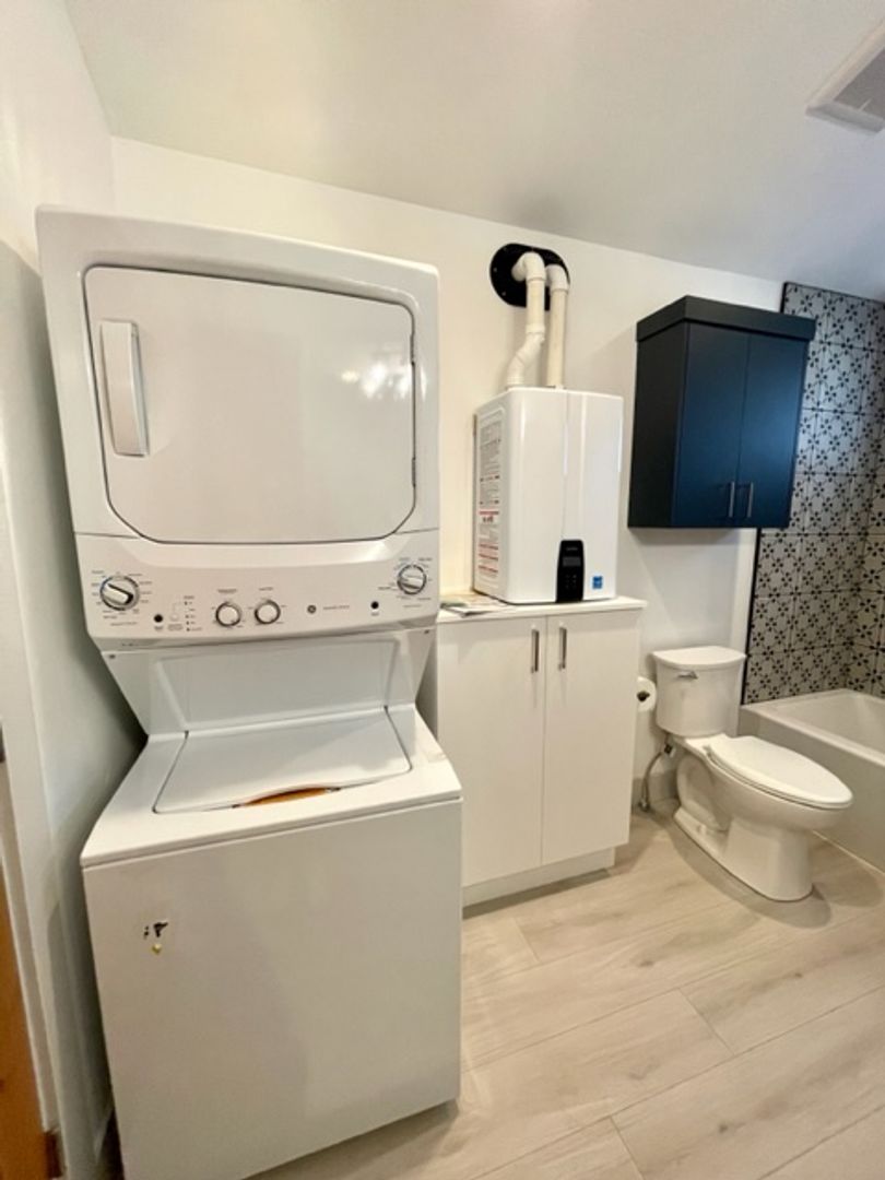 The open kitchen and living room feature beautiful cabinets and stainless steel appliances. There is a gas fireplace in the living room for cozy ambiance! There is a ceiling fan in the living room as well as a ductless A/C unit! The bathroom has a beautiful design and also has a stack-able washer/dryer, tankless water heater and a good amount of space!