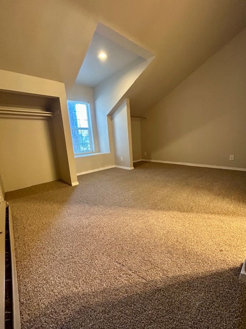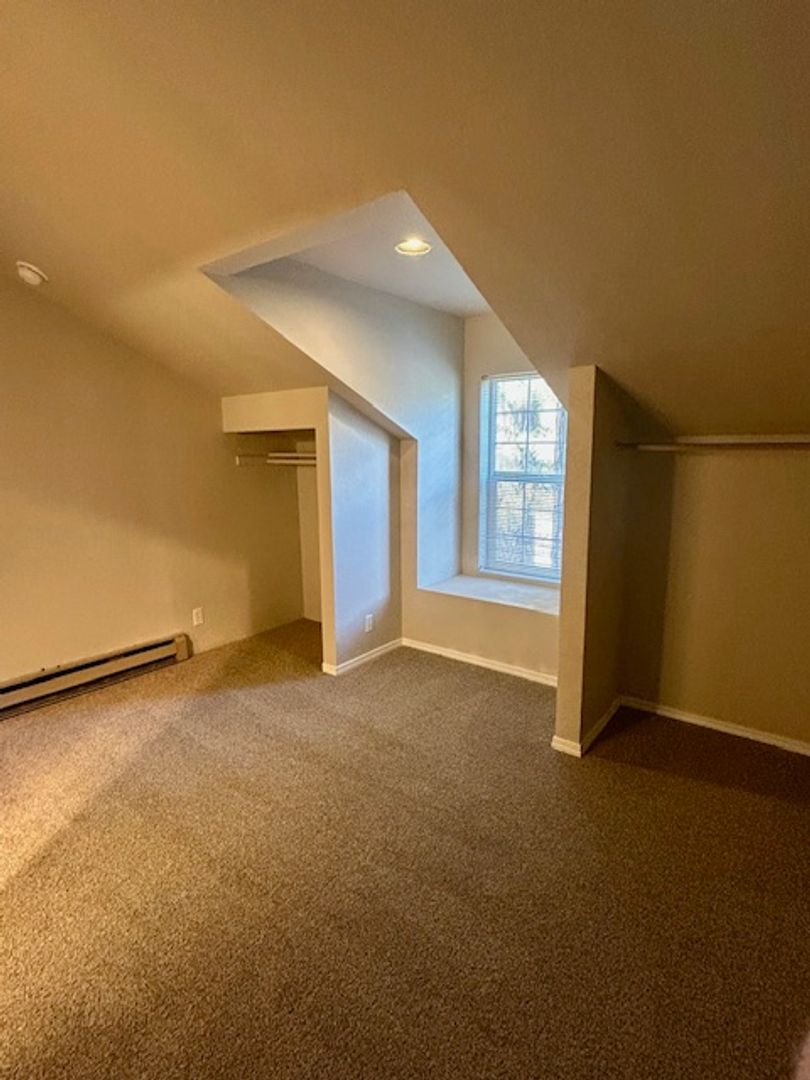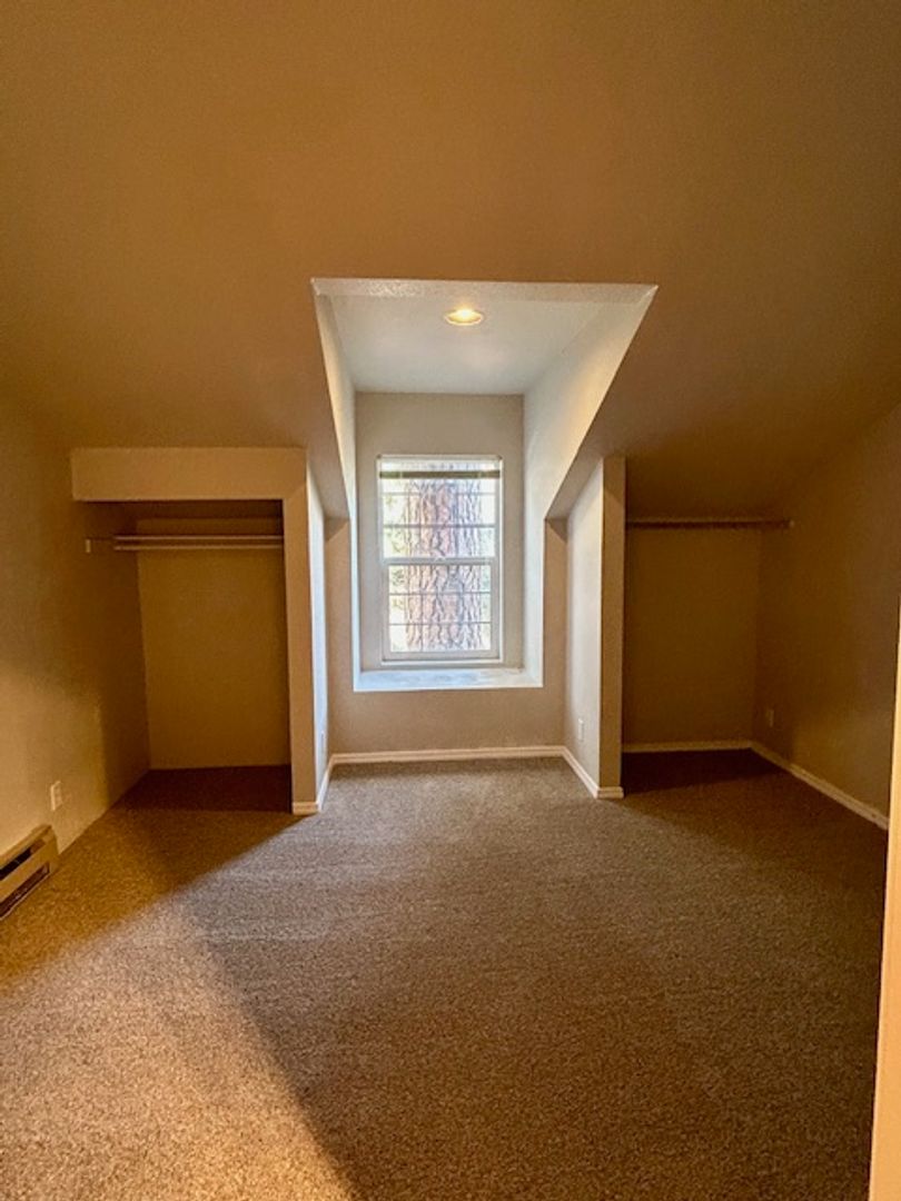 Up another set of stairs into the cozy one bedroom with a huge tree out the window and a nice sized full bathroom!