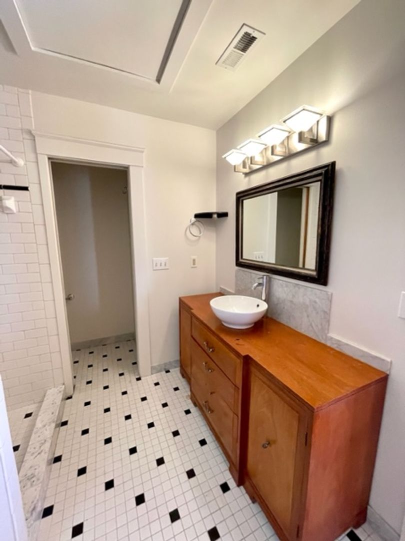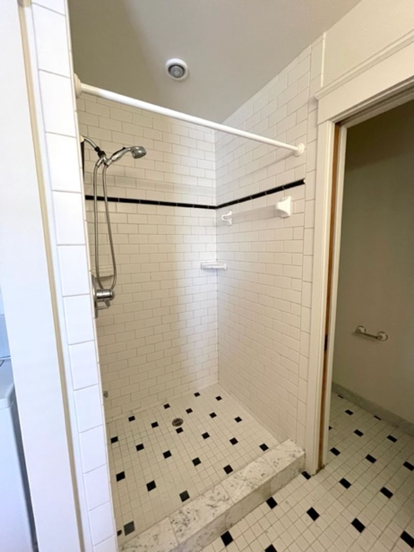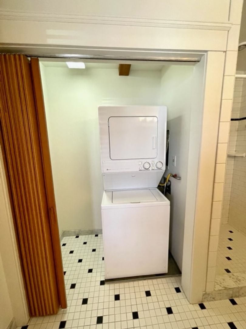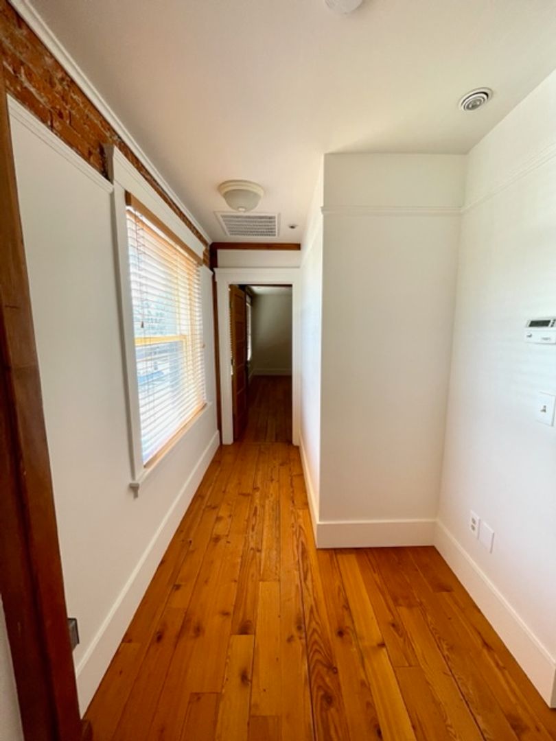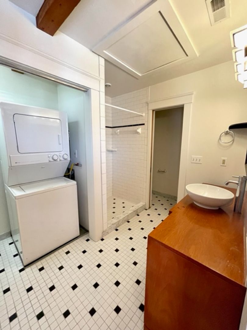 The gem of this home is when you walk into the open living space that has large windows and faces out to Bond St. This space feels so warm and cozy! As you continue on, you are led down the hall to a full bathroom featuring a fun retro tile and a stack-able washer/dryer, sink and shower. Beyond the bathroom is the spacious bedroom with bright big windows.