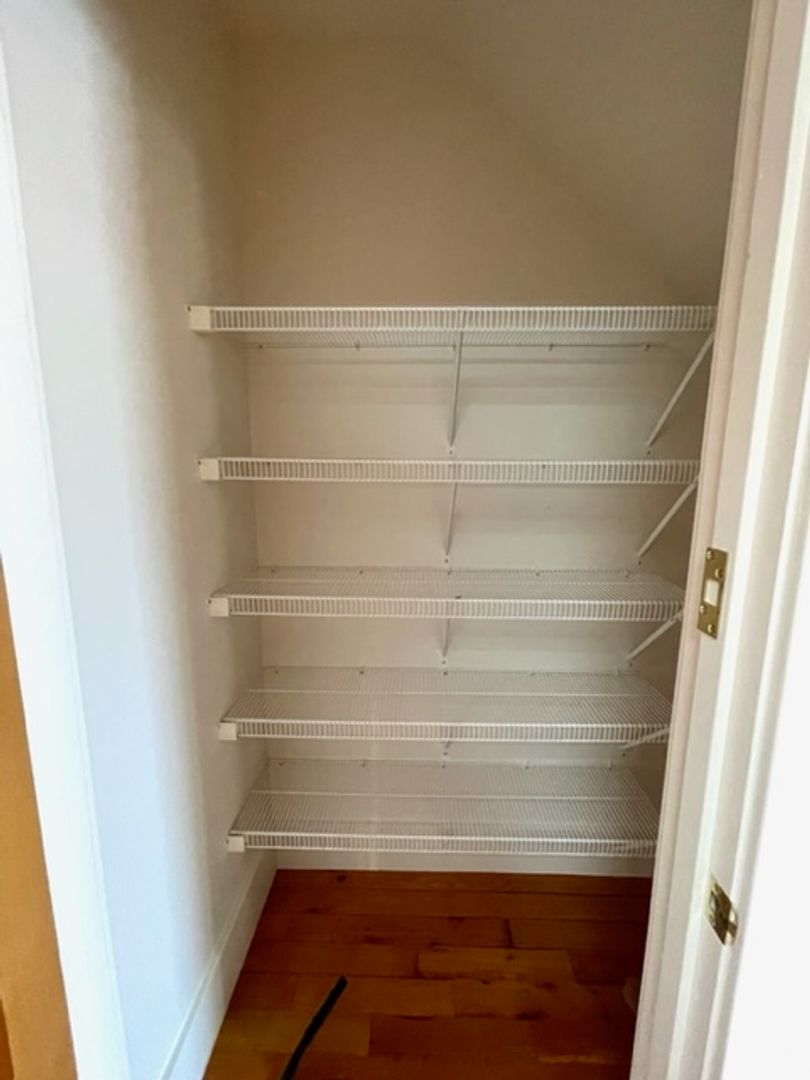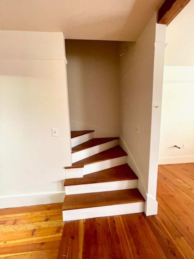 This home has a gorgeous stairway that leads to the unit from Bond St. When you walk into the home, you are greeted with beautiful hardwood floors and a special "stairway" that ends without going anywhere. What a fun feature! The kitchen is bright and updated with stainless steel appliances. There is skylight for lovely light in the kitchen. There is a half bath off of the kitchen. The doors throughout the home have a historic style crystal doorknob.