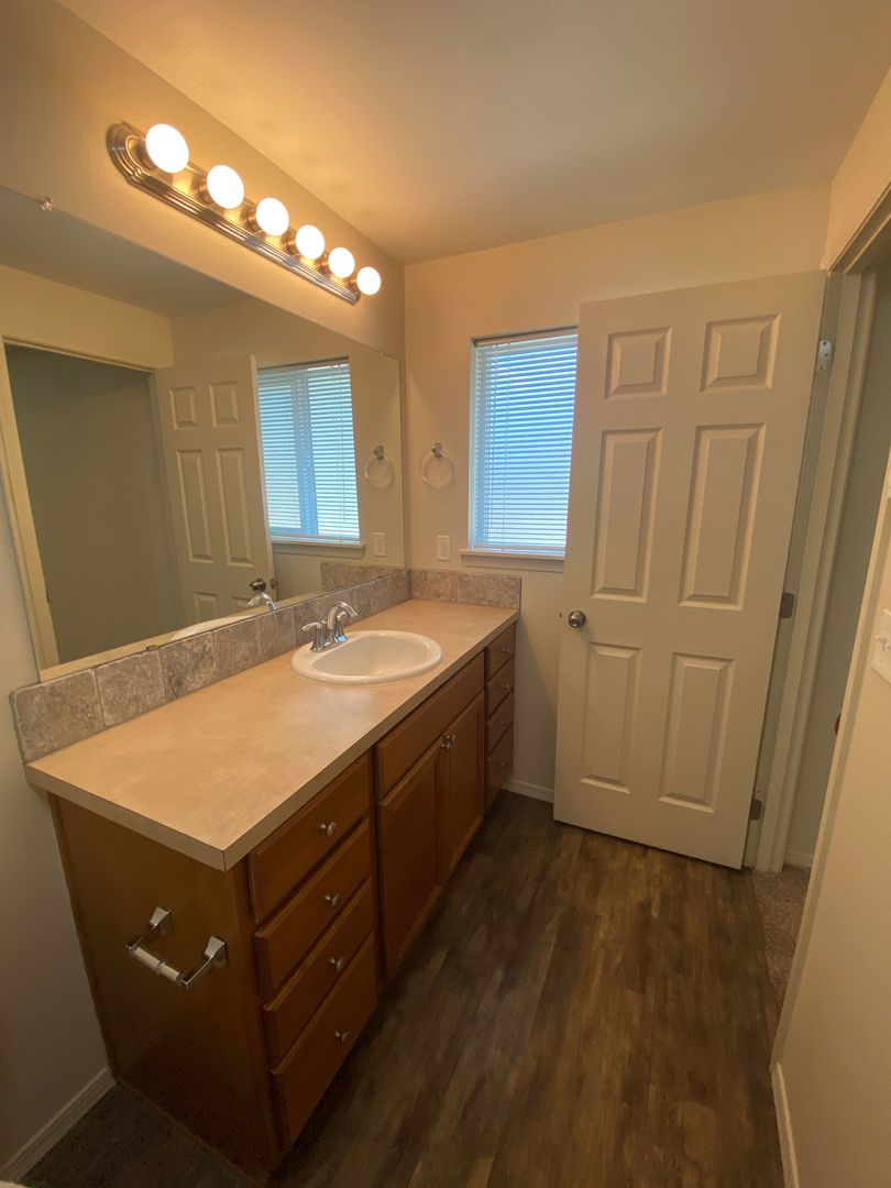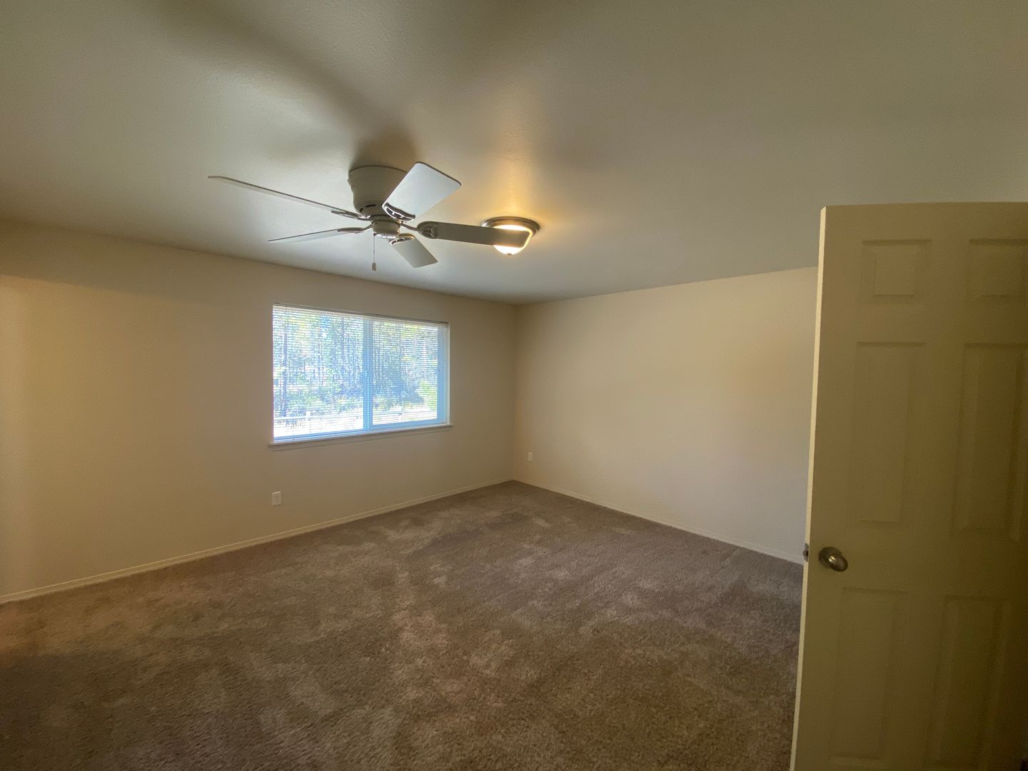 The living area opens to a peaceful backyard surrounded by trees, offering plenty of privacy and space to relax outdoors. Each bedroom feels comfortable and bright, while the bathrooms are clean and modern with ample storage. A separate laundry room includes washer and dryer hookups and a utility sink for convenience. The double-car garage provides extra storage and easy access, and there’s plenty of driveway space for additional parking.