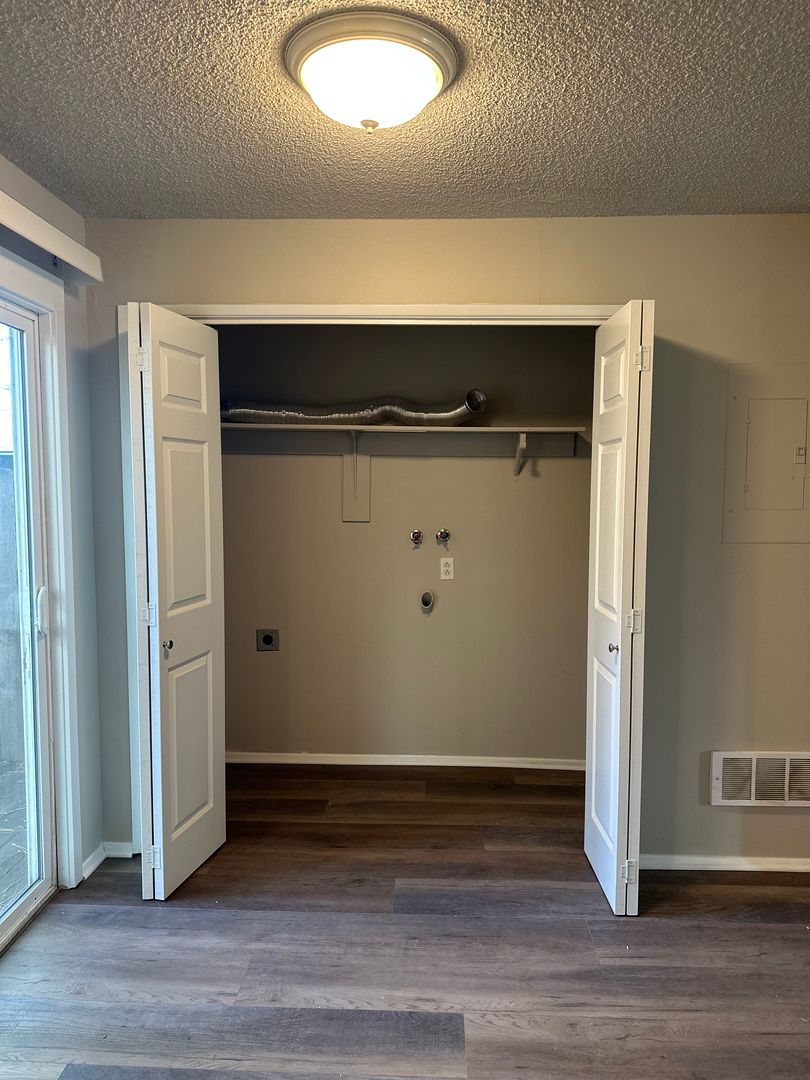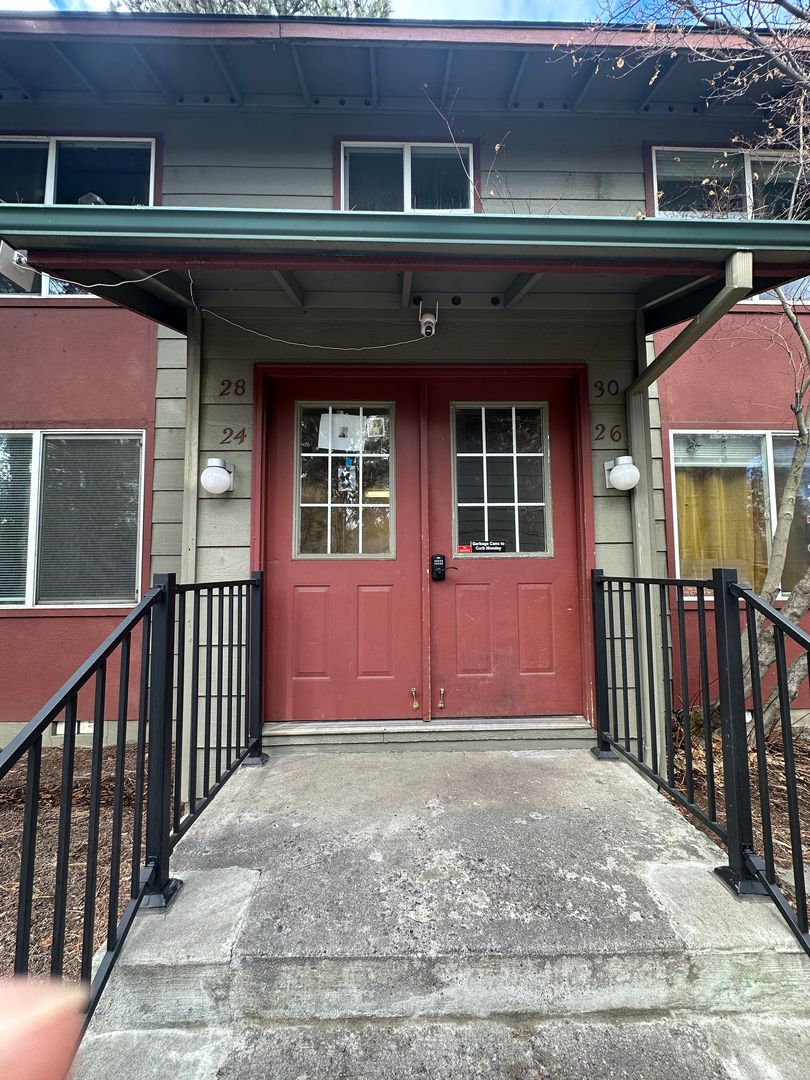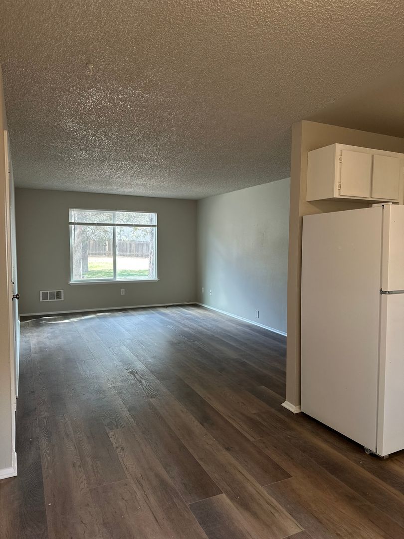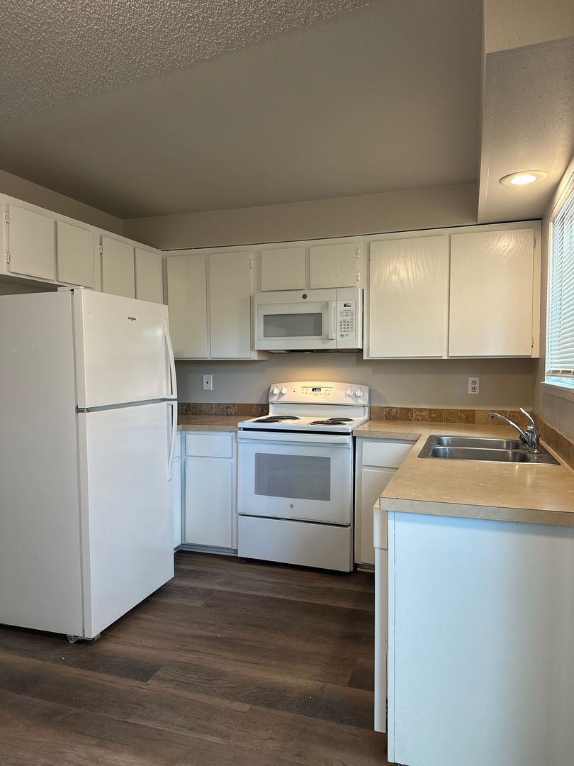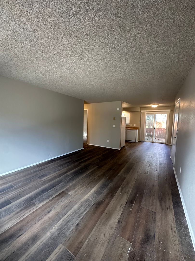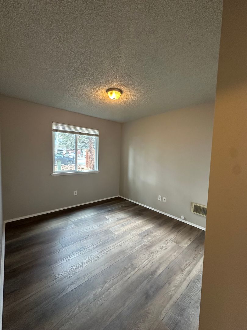 Cozy and updated two-bedroom, one-bath apartment available in Bend, conveniently located near the Old Mill District. This inviting ground-floor home features fresh interior paint, brand new LVP flooring throughout, and newly refreshed kitchen cabinets, giving the space a clean and modern feel. The kitchen offers plenty of cabinetry and space. Washer and dryer hookups add everyday convenience.