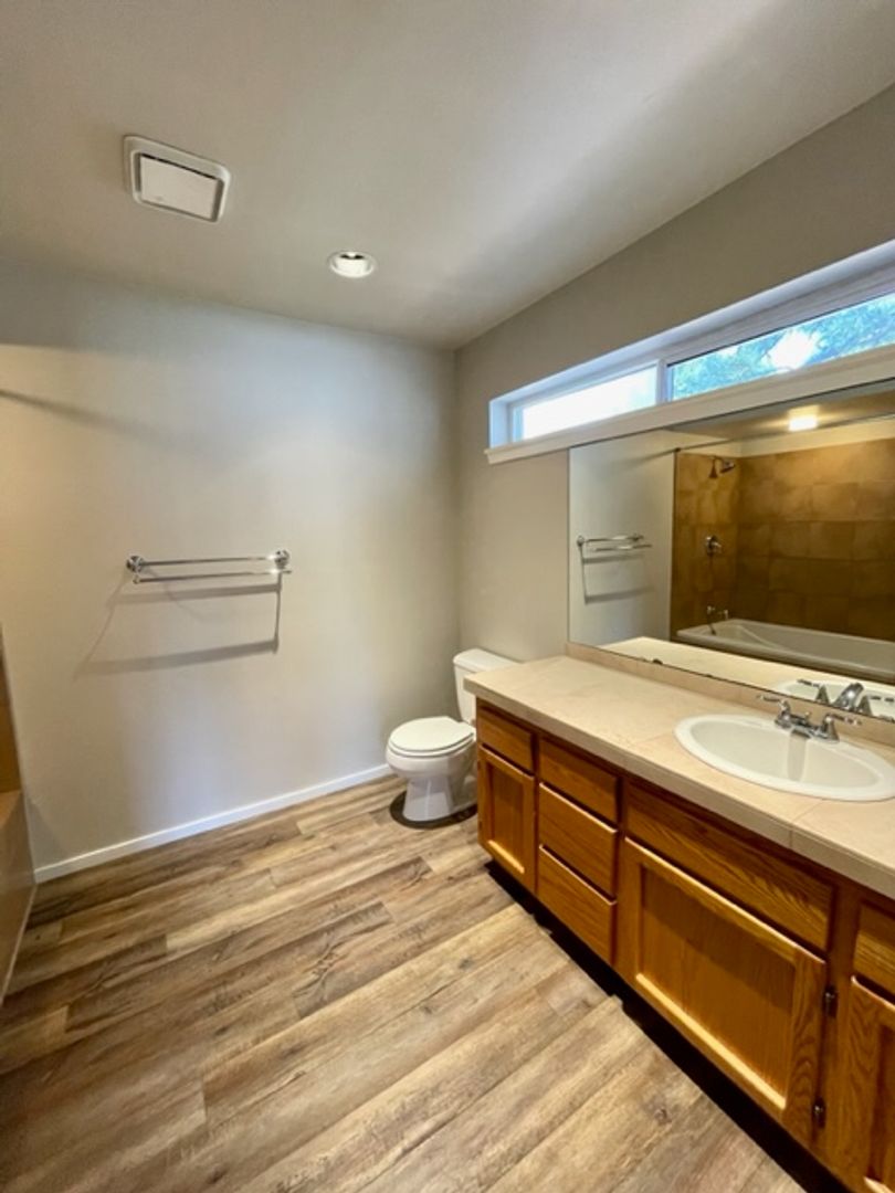 The private primary suite offers vaulted ceilings and is thoughtfully separated from the additional bedrooms for extra privacy. Engineered plank flooring extends through the living, kitchen, and dining areas for easy care and a modern look. Washer and dryer hook-ups are included, and an additional refrigerator in the garage provides extra storage.