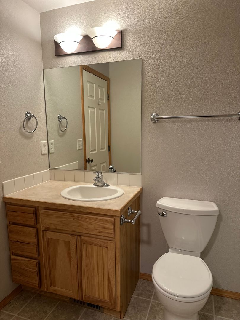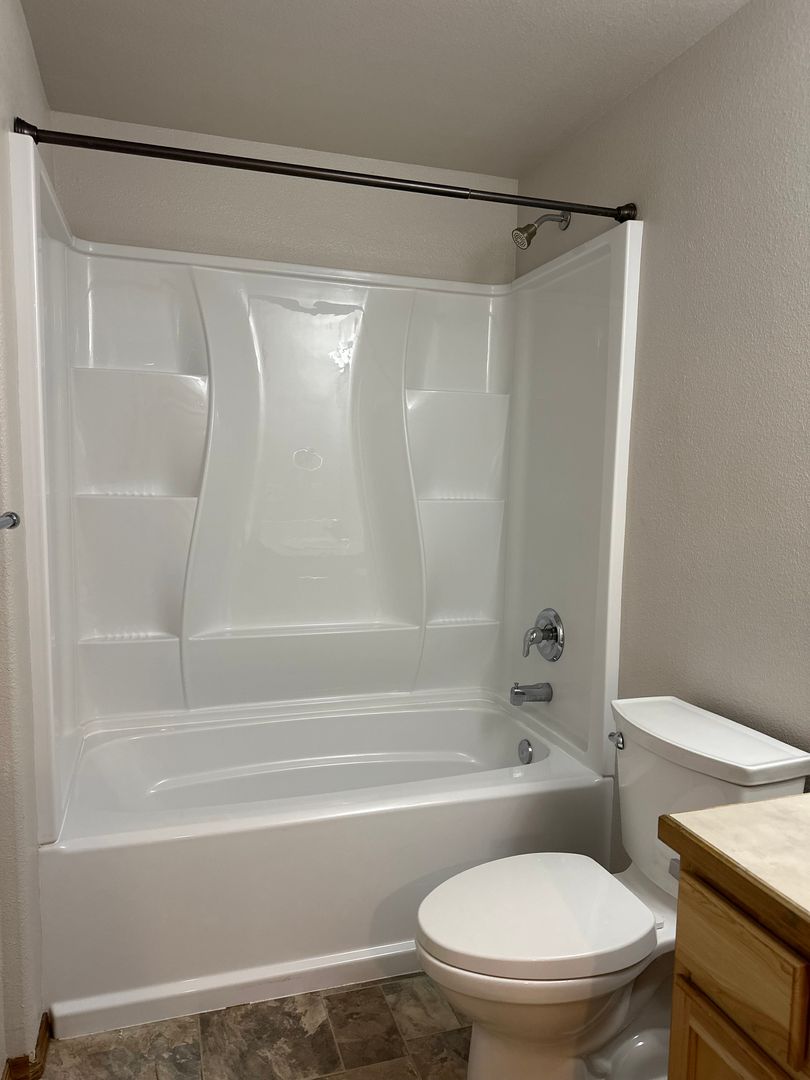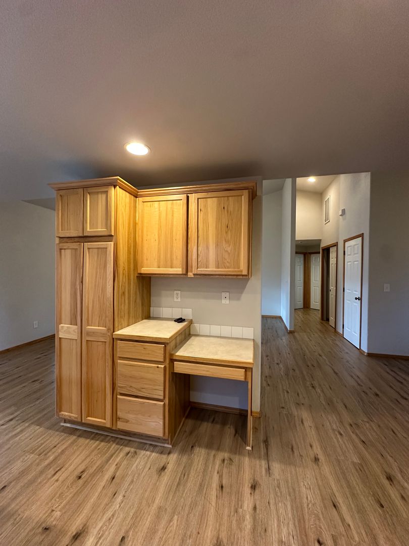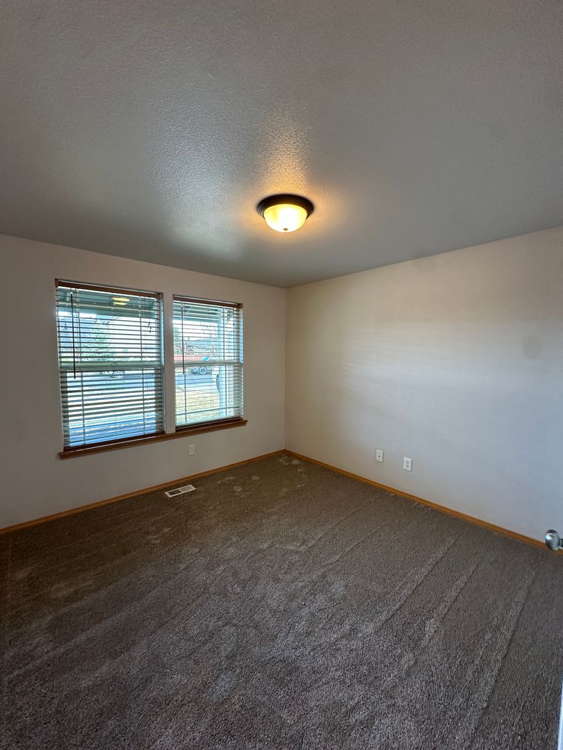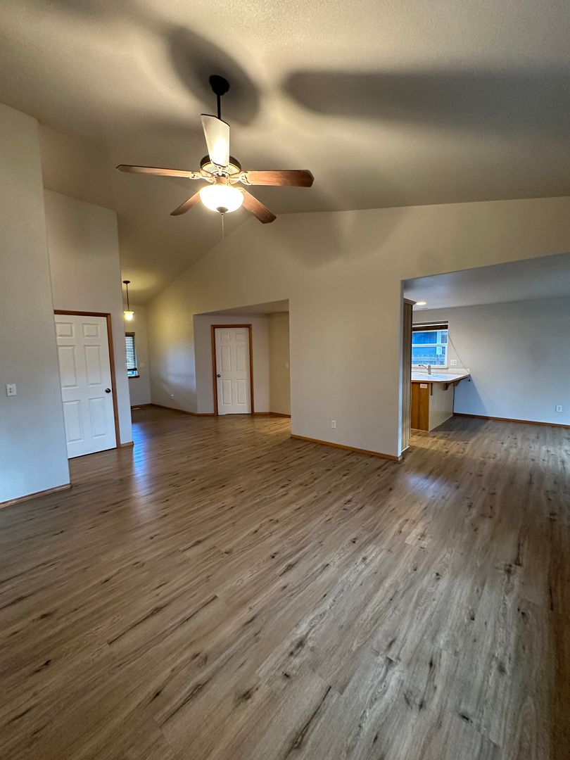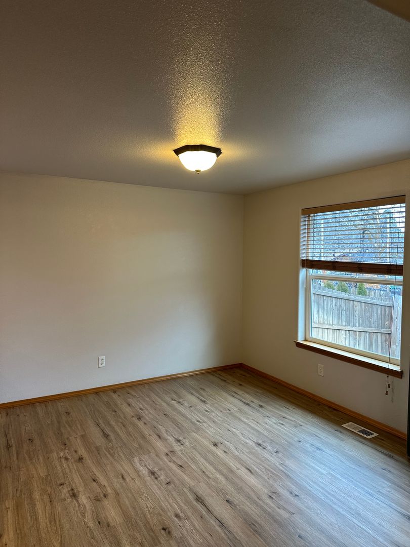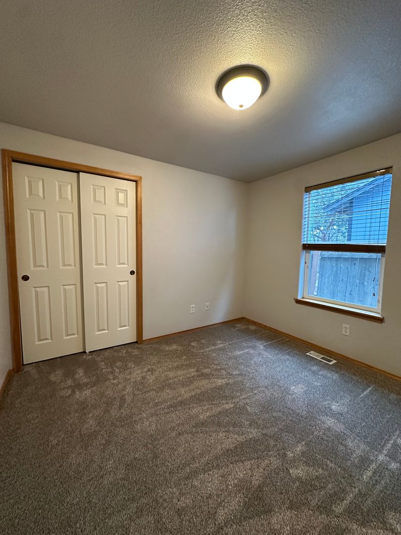 The living area features durable wood-style flooring, abundant natural light, and a cozy fireplace for those cooler Bend evenings. The open kitchen offers ample cabinet space, a convenient breakfast bar, and an easy flow into the dining area—perfect for everyday living and entertaining alike. Just off the main living space, you’ll find a covered patio and fully fenced backyard, ideal for enjoying warm summer days.